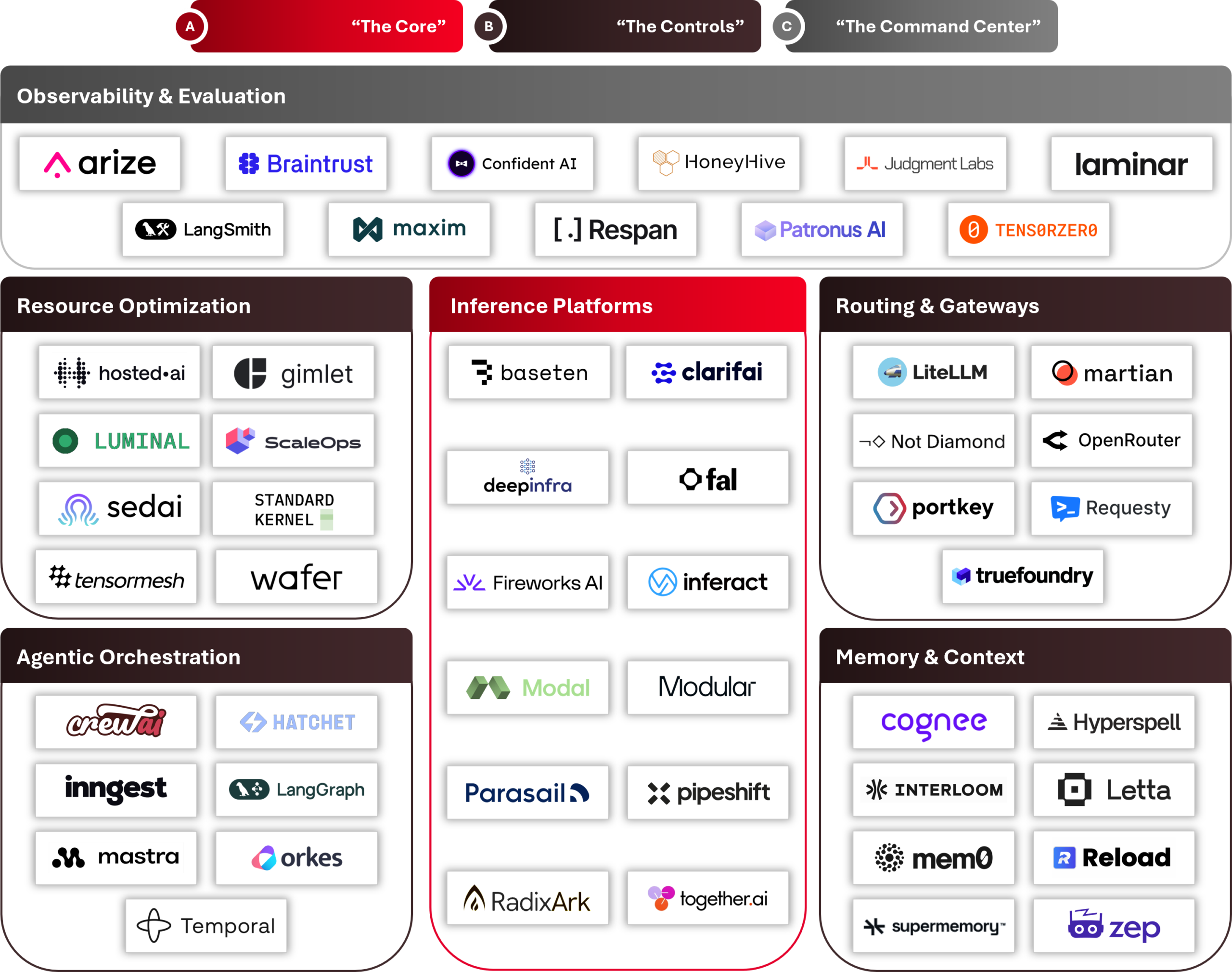 Open-source engines have seen strong adoption, with Inferact (vLLM) and RadixArk (SGLang) commercializing the two most widely deployed open source serving engines, each built for the reliability and throughput demands of production workloads. Teams that don’t want to run the infrastructure themselves can turn to managed providers like Baseten and Fireworks AI which abstract away provisioning, autoscaling, and uptime management. These are among the solutions that represent The Core: inference platforms that determine whether a model call happens at all, whether it returns on time, and whether the system holds up as demand scales.