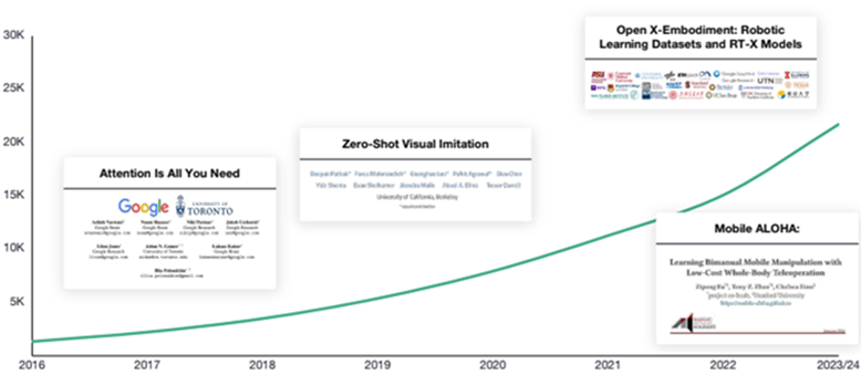 - Research boom: Publications jumped from under 2,000 in 2016 to over 20,000 in 2023. Academic talent is spinning out startups like Physical Intelligence (Berkeley/Stanford) and Cobot (MIT).