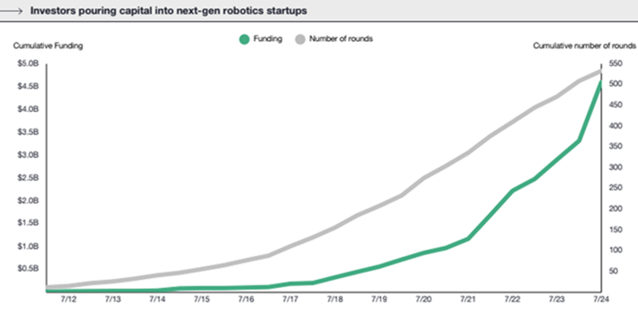 - Investment surge: Funding for robotics startups has spiked, reflecting growing investor conviction.